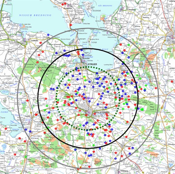 På det kortet er vist leverandørerne af husdyrgødning, fordelt på bedriftsart, samt deres afstand til hovedanlægget.